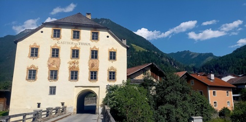 Mit der ÖBB geht es von Insbruck Hbf. nach Imst, wo wir auf den Fernradweg stoßen. Der Start der Tour fühlte sich gut an. Ein schöner heißer Sommertag; so kann es bleiben. Es war auch der einzige Tag mit Rückenwind. Was wir gelernt haben: Der sog. "Talwind" bläst bergauf und wird zum Abend hin immer stärker. Pfunds ist ein angenehmer Touristenort mit zahlreichen Restaurants. Wir essen im Kreuz. Dort fliehen wir nach kurzer Zeit draußen vor dem immer heftiger werdenden Talwind in den Gastraum. Ü/F (137,60 EUR) in der Pension Gabl [Dorf 104; Tel. +43 5474 5060 und 43 660 43 23 287]. Sehr gepflegte Unterkunft, geschmackvolles großes Zimmer, reichliches Frühstück, sehr nette Wirtin. |