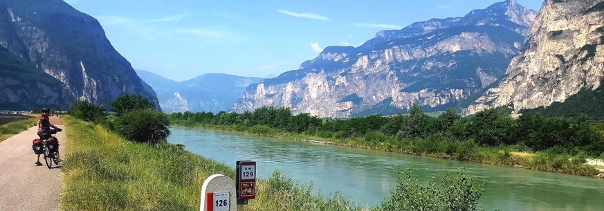 Die inzwischen breite Etsch im tief eingeschnittenen Tal bei Mezzocorona. Radweg wie immer: perfekt!