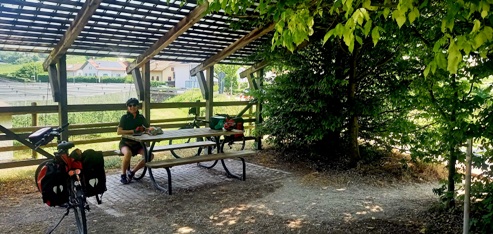 << Fast jeden km kommt ein Rastplatz; wir wählen einen lauschig überdachten. |