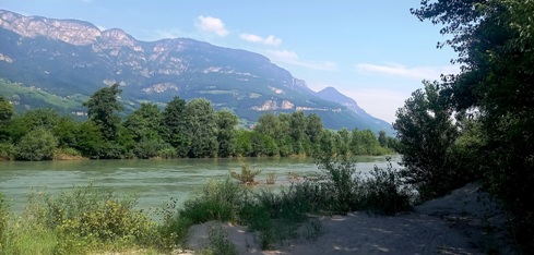 Die inzwischen breite Etsch im tief eingeschnittenen Tal bei Mezzocorona. Radweg wie immer: perfekt!