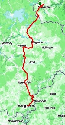 | Ein Genusstag: Die am Vortag erworbene Höhe wird in schönen, teils rasanten Abfahrten (südl. St. Vith) wieder neutralisiert. Ohne jeglichen Verkehr geht es am technischen und geschichtlichen Kuriosum (>> Versailler Vertrag!) im deutsch-belgischen Grenzgebiet bis ins Dreiländereck an der Our (B-L-D) zum Etappenziel in B-Burg Reuland. Mal durch Mittelgebirgswald, mal durch Trockenwiesen oder Hochmoore.