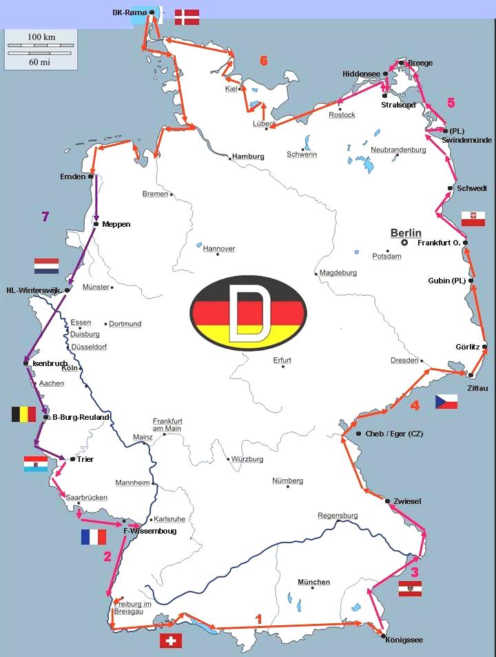 Die Hoffnung, für die Höhen des Bayrischen und des Böhmerwaldes im Juni warmes, trockenes Wetter zu erwischen, hat sich nicht ganz erfüllt. Immerhin ging es fast auf 1.300 m hinauf. Tief "Jutta" machte ein Ende mit dem Plan, Deutschland trocken zu umrunden. Die Strecke wurde in Zwiesel wegen Starkregens beendet. Anfahrt mit MeinFernbus nach München, am nächsten Tag weiter mit DB nach Berchtesgaden, dem Endpunkt der 1. Strecke. "Hart an der Grenze entlang" hieß diesmal überwiegend durch Österreich und Tschechien zu fahren. Glückliche Streckenwahl, max. 30 % im Verkehr, sonst auf sehr schönen Radwegen entlang der Salzach, dem Inn und schließlich auf dem Europäischen Radweg Nr. 13 durch Tschechien. |